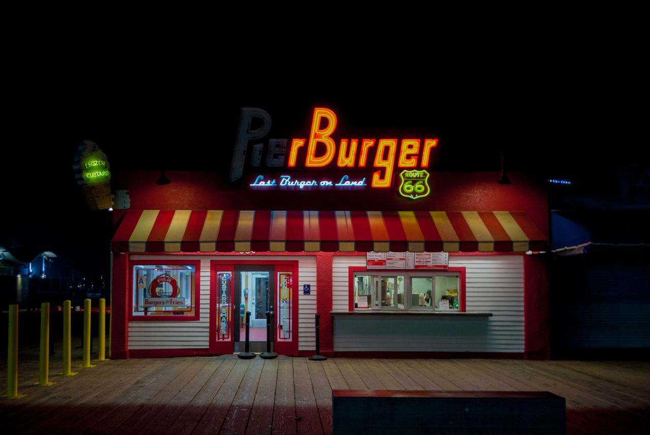 An aesthetically pleasing burger stand on the Santa Monica Pier.